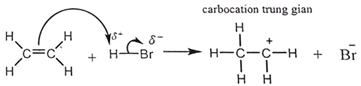 Giai đoạn 1 của phản ứng là quá trình (tác nhân electrophile (∗)) phản ứng với C=C, tạo carbocation trung gian: