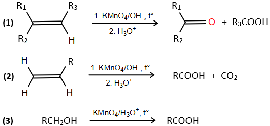 Biết: Trong hóa học hữu cơ, liên kết đôi C=C và alcohol bậc I có thể bị oxi hóa bởi KMnO4 theo sơ đồ sau: