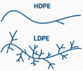 HDPE có chuỗi thẳng, ít nhánh, các mạch polymer xếp khít, mật độ cao.