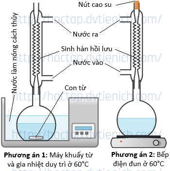 Một nhóm học sinh tiến hành thí nghiệm điều chế nitrobenzene theo phương án 1 như hình vẽ. Cho con từ vào bình cầu, thêm 30 mL H2SO4 đặc, làm lạnh trong chậu nước đá rồi thêm từ từ 30 mL HNO3 đặc, sau đó cho 10 mL benzene và lắp sinh hàn hồi lưu rồi đun cách thủy trong 60 phút. Biết rằng, máy khuấy từ cung cấp nhiệt lượng đồng thời hệ thống nam châm quay tạo từ trường làm xoay con từ bên trong bình cầu.