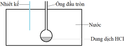 • Bước 1: Lấy 1000 gam nước cho vào bình cách nhiệt (nhiệt không thoát ra bên ngoài); cho tiếp 20 gam dung dịch HCl 14,6% vào ống đầu tròn và đặt nhiệt kế vào trong bình (xem hình vẽ). Dữ kiện được tính toán cho biết nhiệt lượng để nâng nhiệt độ của hệ phản ứng lên 1°C là 4205 J.