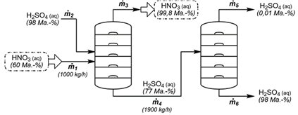 Nitric acid 60% chảy vào cột thứ nhất với lưu lượng m1 = 1000 kg/h. Một dòng khối lượng m3 của nitric acid đậm đặc (99,8% theo khối lượng) được lấy khỏi cột và một dòng khối lượng m4 = 1900 kg/h của sulfuric acid 77% chảy vào cột khác. Trong cột này, sulfuric acid được cô đặc trở lại, nhưng một dòng khối lượng m5 của sulfuric acid loãng (0,01% theo khối lượng) được tạo ra dưới dạng nước thải.