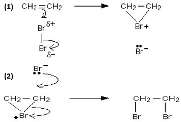 Phản ứng hóa học của ethylene với bromine trong dung dịch xảy ra qua hai giai đoạn theo cơ chế như sau: