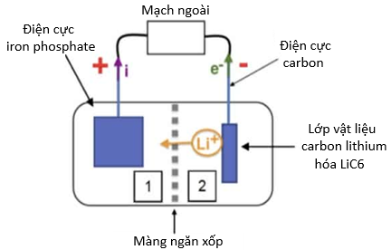 Cấu tạo của pin: Điện cực iron phosphate (FePO4), ở ngăn 1 có khối lượng mFePO4 = 4,7 kg. Khi pin được sạc đầy, điện cực ở ngăn 2 được bao phủ bởi một lớp vật liệu carbon đã lithium hóa (công thức LiC6) nặng 1,1 kg. Các điện cực này được nhúng trong chất điện li hữu cơ dạng ion có chứa ion lithium và hai ngăn được phân cách bởi một màng ngăn.