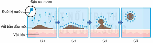 (c) Khi xà phòng, chất giặt rửa tan vào nước sẽ tạo dung dịch có sức căng bề mặt nhỏ làm cho vật cần giặt rửa dễ thấm ướt. Đuôi kị nước trong xà phòng và chất giặt rửa thâm nhập vào vết bẩn (Hình c), phân chia vết bẩn thành những hạt rất nhỏ có đầu ưa nước quay ra ngoài (Hình b), các hạt này phân tán vào nước và bị rửa trôi (Hình d).