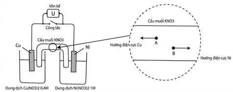 Tại 25°C, một pin điện hoá được thiết lập bởi một điện cực Ni nhúng trong dung dịch Ni(NO3)2 1,0M và một điện cực Cu nhúng trong dung dịch Cu(NO3)2 0,4M (mô tả như hình vẽ).