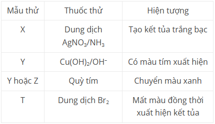 Tiến hành thí nghiệm với 4 dung dịch X, Y, Z, T đựng trong các lọ riêng biệt, kết quả được ghi trong bảng sau: