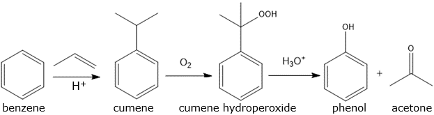Trong công nghiệp, phenol và acetone được sản xuất từ cumene, khoảng 20% lượng cumene toàn cầu được sản xuất từ benzene. Các phản ứng xảy ra theo sơ đồ sau: