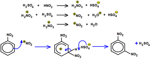 (b) C6H5NO2 + HNO3 —> m-C6H4(NO2)2 + H2O (1 : 1, H2SO4 đặc, nóng)