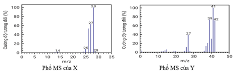 X và Y là hai hydrocarbon đều chứa 85,71% khối lượng nguyên tố carbon. Phổ MS của hai mẫu hợp chất này được cho trong hình sau: